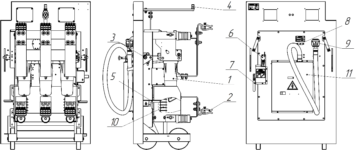1 – вакуумный выключатель; 2 – втычной контакт; 3 – вал перемещения ВЭ из контрольного в рабочее; 4 – элемент для взаимодействия со шторочным механизмом шкафа КРУ; 5 – контакты заземления выкатного элемента; 6 –МБО; 7 – ручка блокировки перемещения выкатного элемента; 8 –механический указатель состояния; 9 –кабель подключения выкатного элемента; 10 – ОПН; 11 – отсек блока управления